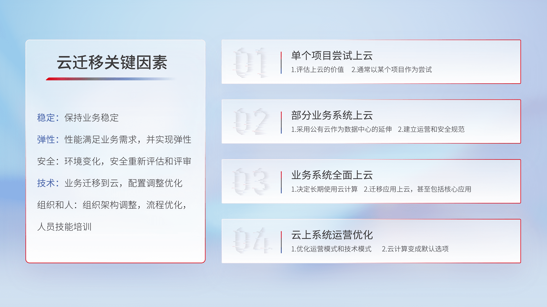 结合实际业务,,,从规划设计、、、、云平台选型、、、、云原生改造、、数据迁移、、、、集成交付,,,,迁移全过程为客户识别最佳上云路径,,做好风险识别管理,,,设计网络架构、、身份权限、、安全审计合规、、操作审计、、、日志审计、、、、监控告警策略、、、、多站点容灾设计等,,,对云上基础设施进行整体规划,,提升IT治理水平,,,以满足弹性、、、、高可用、、高性能的需求。。。